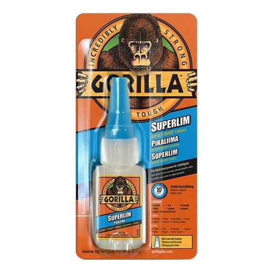 Gorilla Superlim er den superlim, der virkelig holder og størkner på kun 10 sekunder. Limen har små gummipartikler i sig, hvilket er lig med en lav risiko for, at limen revner ved eksempelvis slag, og dine reparationer bliver derfor mere holdbare. Vi kalder det særdeles slagfast. En flaske Gorilla superlim holder gummi, papir, træ, læder, metal, keramik og meget andet ordentligt på plads. Flaskens dyse har en indbygget metalstift, som forhindrer, at dysen tilstoppes.