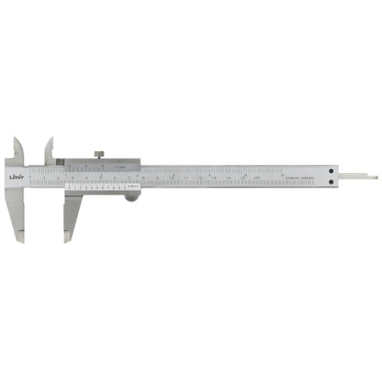 Limit skydelære m/skrue 4-funktion. Af rustfrit stål. Fuldt hærdet. Matforkromet skala. Inddelt i millimeter og eng. tommer. Noniusskala for 1/128" og 1/20 mm af 39 mm længde. Udstyret med dybdemål og spidser til indvendig måling. DIN 862.